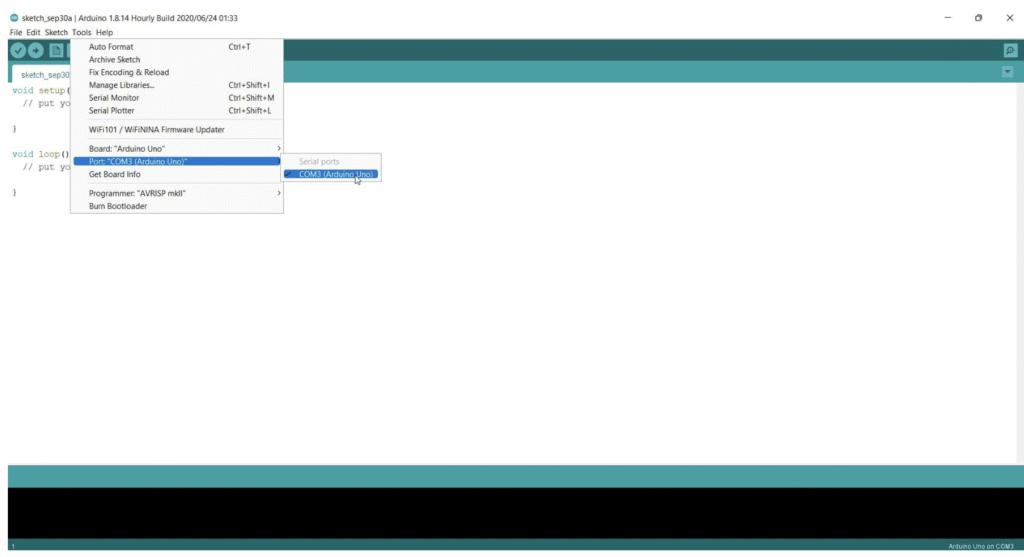 پورت اتصال میکروکنترلر را مشخص میکنیم. توجه داشته باشید که ممکن است شماره COM پورت کامپیوتر شما با هر کامپیوتر دیگری فرق داشته باشد.